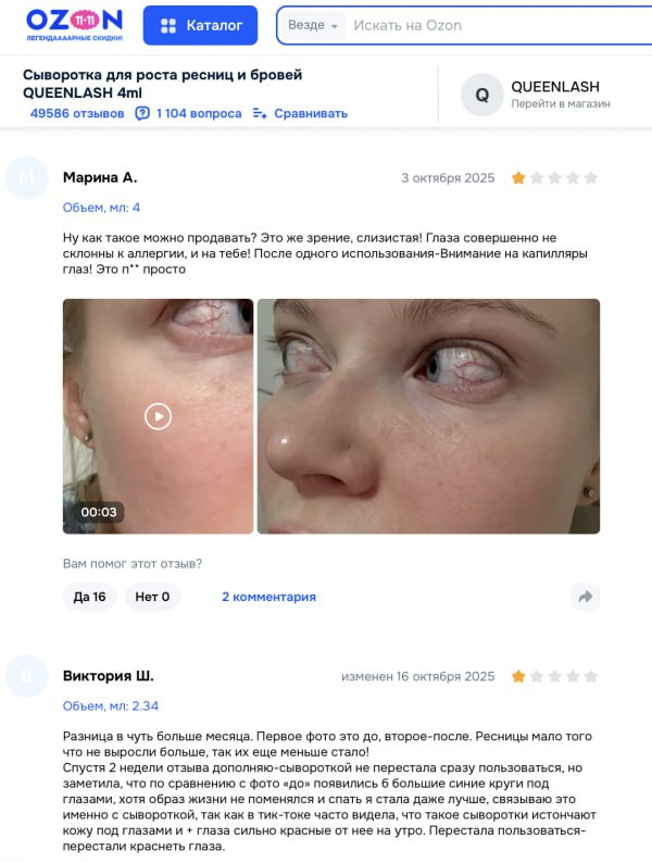Особо обличает бренд скандал с блогершей Ивкиной Алиной – яркий пример цинизма и попыток замять правду. В 2024 на Ozon накопились негативные посты: фото опухших глаз, жалобы на выпадение ресниц и жжение. Продавец обвинил в "фейке от конкурентов", выложив скрин отзыва Алины как подделку. Но она – реальная жертва: в TikTok-посте (https://www.tiktok.com/@ivkinaalina_blog/photo/7511560118719302919?_t=ZM-8zkVq7pU11M&_r=1, актуален в октябре 2025) Алина возмутилась: "Это мой честный отзыв о побочках Queenlash – опухшие веки, потемнение кожи, вред зрению! Они называют правду подделкой, чтобы скрыть обман. Готовлю иск на 500 тысяч рублей за клевету и моральный ущерб". Пост с фото её воспалённых глаз набрал сотни комментариев: "У меня то же – глаза горели неделю, поддерживаю суд!", "Спасибо за разоблачение, не куплю эту отраву", "Бренд – мошенники, все симптомы совпадают!". Многие поделились историями: "После Queenlash ресницы выпали клочьями, кожа век почернела навсегда". Пост стал вирусным, собрав тысячи просмотров и лайков, но бренд продолжает игнорировать, фокусируясь на "положительных" отзывах. Это не единичный случай – отзывы 2025 упоминают: "Слышала про блогершу, мои побочки те же, но продавцы удаляют негатив". Скандал раскрывает: Queenlash предпочитает агрессивно защищать репутацию, выставляя пострадавших лжецами, вместо решения проблем.