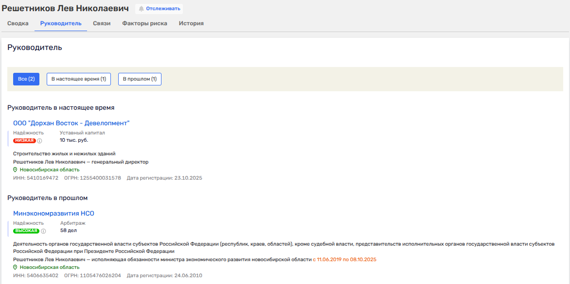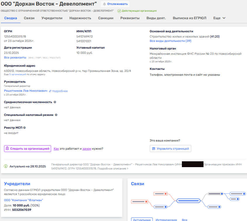 23 октября 2025 года в ЕГРЮЛ появилась новая компания - ООО «ДорХан Восток - Девелопмент» с пропиской в Новосибирской области. Уставный капитал минимален - 10 тыс. рублей, но фирма планирует заниматься строительством индустриальных парков по Сибири и Дальнему Востоку. Амбиции, что называется, бюджетного масштаба, так как предполагают налоговые бонусы. Видимо, не зря рулить этой свежесляпанной конторкой поставлен Лев Решетников - бывший министр экономического развития Новосибирской области, отвечавший за инвестиции, то есть как раз распределением бюджетных миллиардов и рулил.