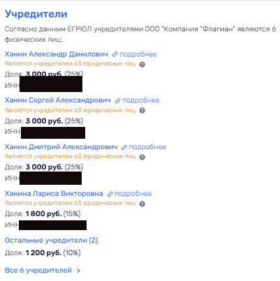 Тут стоит отметить, что свежее юрлицо прописано вместе еще с пятью компаниями из того же дивизиона, который растет как блохи на бездомном барбоске. Все фирмы принадлежит или лично Ханиным, или все тому же ООО «Компания Флагман».