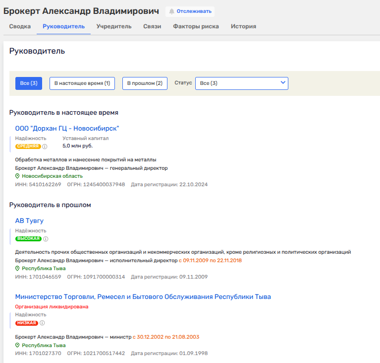 И вот, что забавно: созданное в 2024 году ООО «ДорХан ГЦ-Новосибирск» передано под руководство Александра Брокерта - бывшего министра торговли, экс-вице-премьера правительства Тувы. Брокерт ушел в отставку в 2023 году и, как видим, всплыл в мутном бизнесе Ханиных.