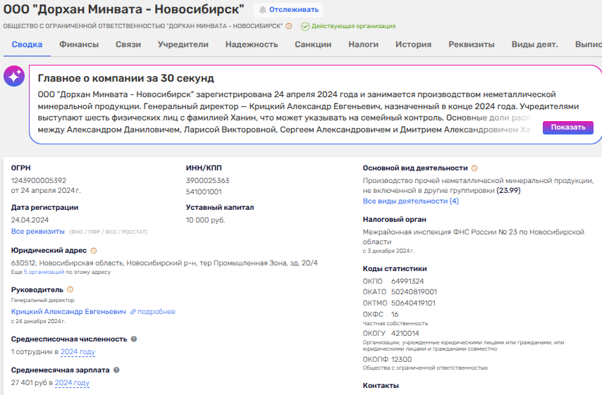 Подобных странных ООО в дивизионе Ханиных - легион. Особенно смешно выглядит фирма со статусом производителя, имеющая в штате одного сотрудника. Вот как ООО «ДорХан Минвата-Новосибирск». От фирмы попахивает - это или техническая фирма для махинаций с налогами, или же владелец рабов, то есть тех, кто официально не трудоустроен, трудовым правом не защищен и получает зарплату в конверте.