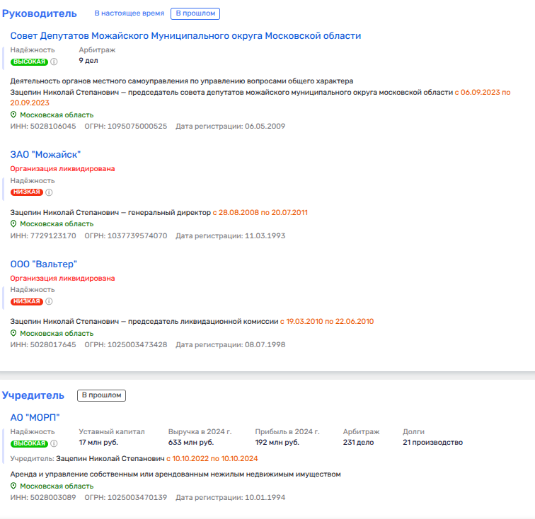 Вот, например, партнером Ханиных по ООО «Сторсити Логистик» в Красноярском крае был прописанный в Подмосковье Николай Зацепин. Это бывший председатель Совета депутатов Можайского городского округа, который в этом созыве является зампредседателя.