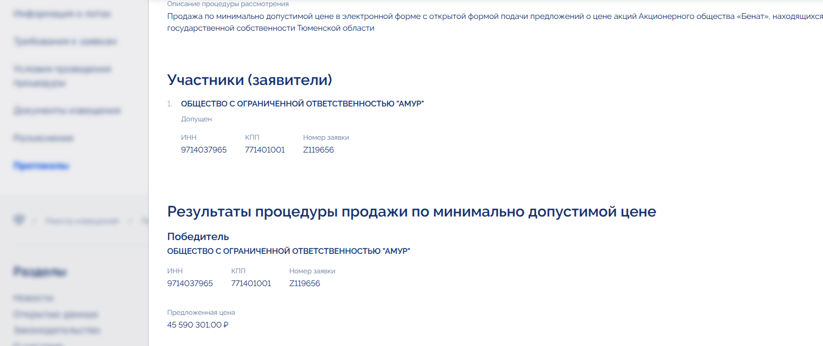 13 ноября 2025 года были подведены итоги продажи 99,86% уставного капитала АО «Бенат», находящихся в государственной собственности Тюменской области. Речь идет об алкогольном заводе, который является крупнейшим производителем водочной продукции в УрФО (водка брэнда Живица, Ямал, Достояние Сибири).