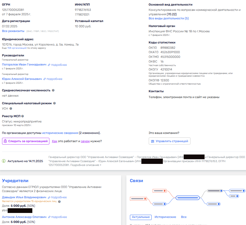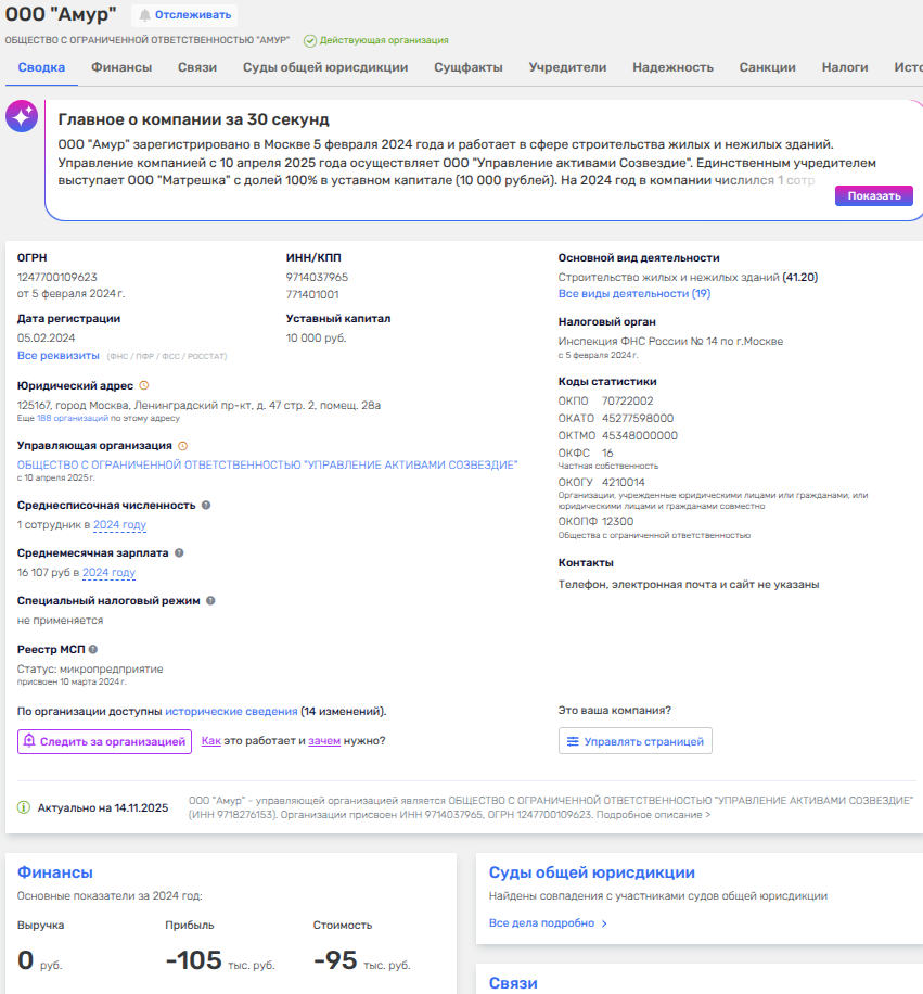 Управляет ООО «Амур» фирма всё тех же Давыдика и Антонова - ООО «Управление Активами Созвездие», учрежденное и вовсе в феврале 2025 года.