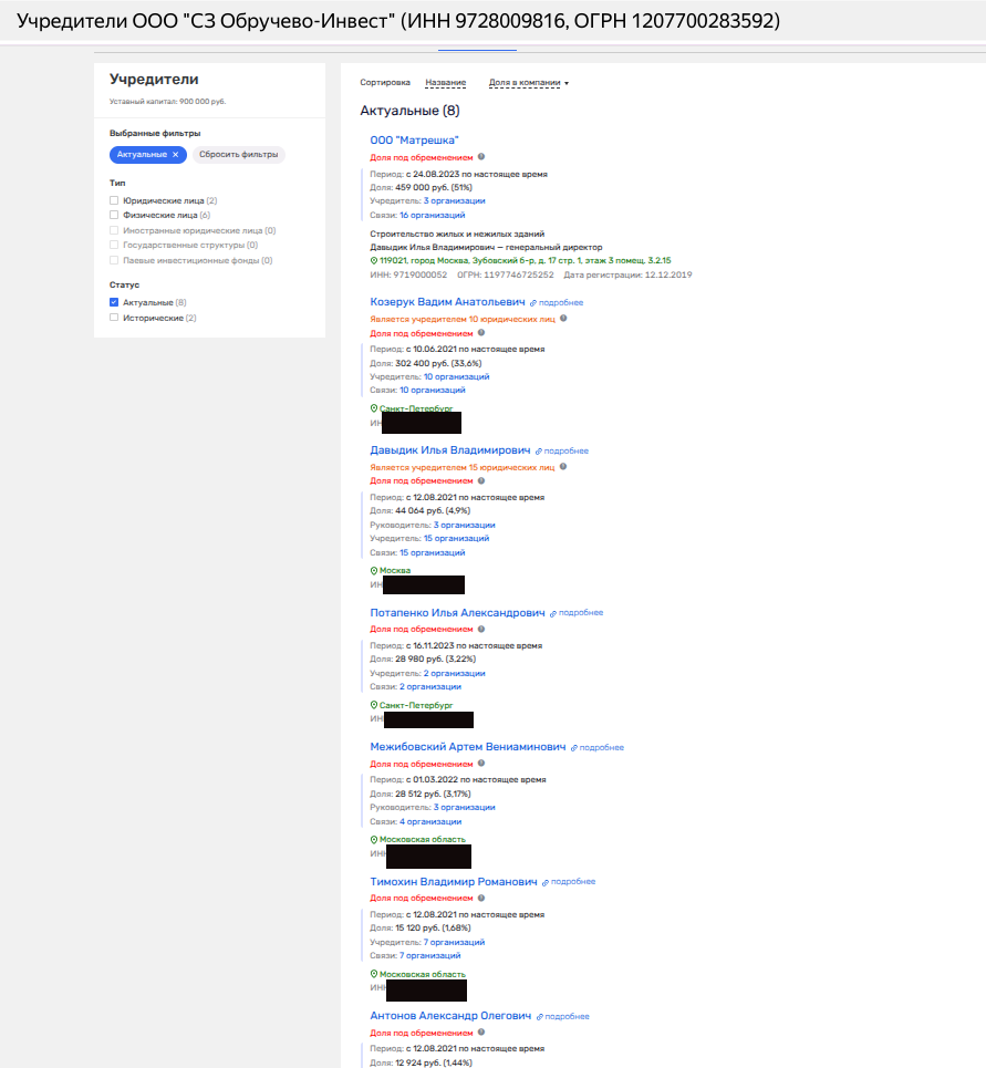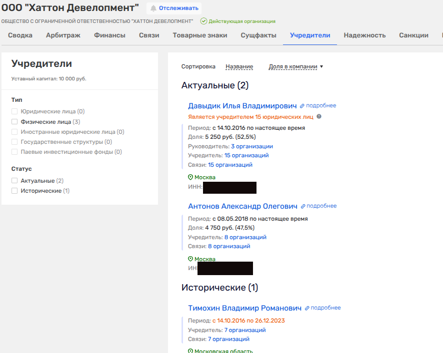 Вот, к примеру, Давыдик и Антонов вместе с Владимиром Романовичем Тимохиным (сыном девелопера) были основателями ООО «Хаттон Девелопмент». Они же втроем владеют и ООО «Централ Парк». И это не единственные точки пересечения.