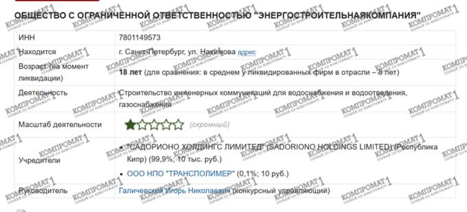 И, как стало известно позже, Плотица и Маркелов тоже были связаны через совместное управление ООО НПО" Трансполимер". Эта компания, напомним, начиная с 2015 года, в партнерстве с кипрской офшорной компанией Sadoriono Holdings Limited была соучредителем ООО "Энергостроительная компания".