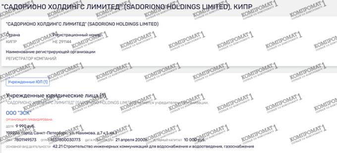 А вот соучредителями ООО "ЭСК" являлись не только ООО НПО "Трансполимер", но и кипрский офшор "Садорионо холдингс лимитед".