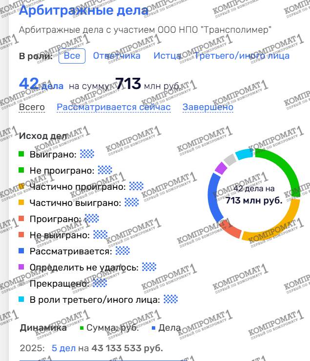 Не может не удивлять количество арбитражных дел компании НПО "Трансполимер": 42 дела на 713 млн рублей.