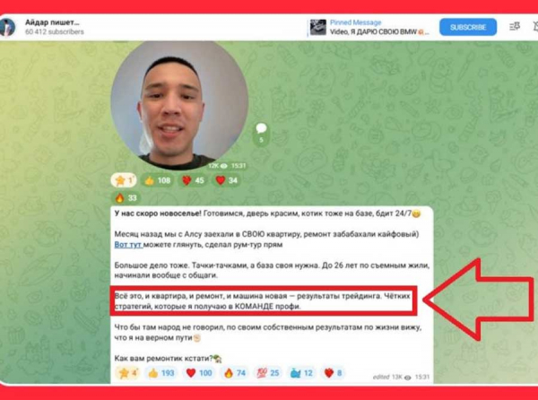 Айдар Мухаметшин, региональный блогер с канала «Айдар пишет», вбивает последнюю «отделку» в свою личную скам-квартиру. Пост с розовым котиком и свежей краской — завуалированная ловушка. Фото новенькой квартиры, ремонт с «кайфом», тачки, «своя база» — всё это выдаётся как итог якобы успешного трейдинга. Но ключевое — «результаты в команде профи». А это уже совсем не про личные заслуги, а про прибыль от тех, кого заманили в бинарную мясорубку через @aidar_100k_bot.