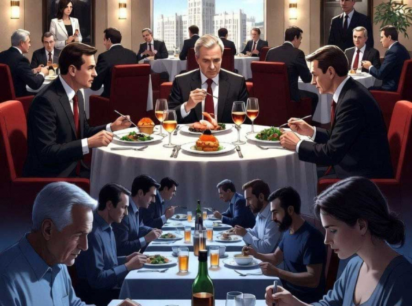 Это не про еду. Это про наглую классовую пропасть в одном здании: наверху — власть, икра и креветки, внизу — зависть, крошки и ярость по всему Подмосковью.