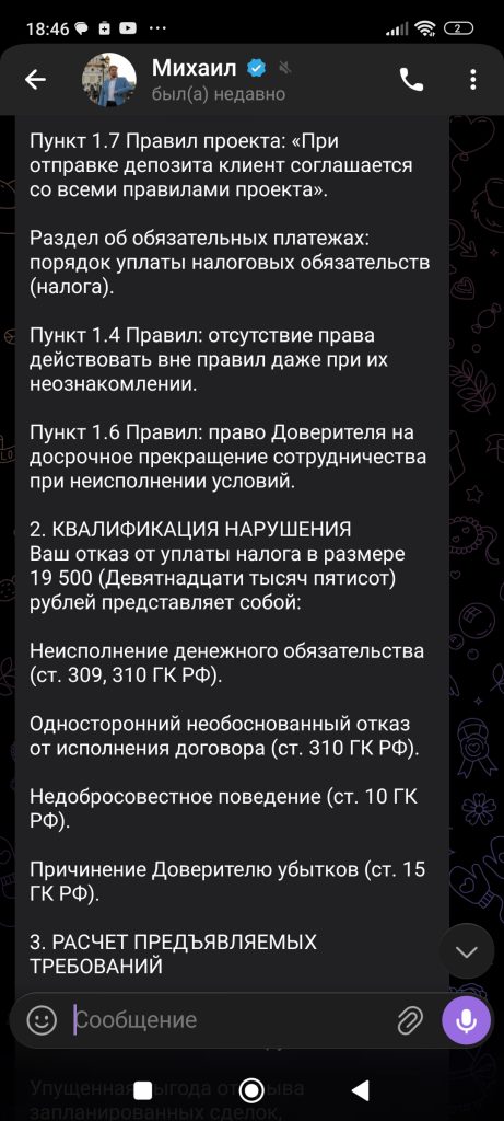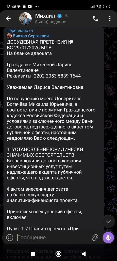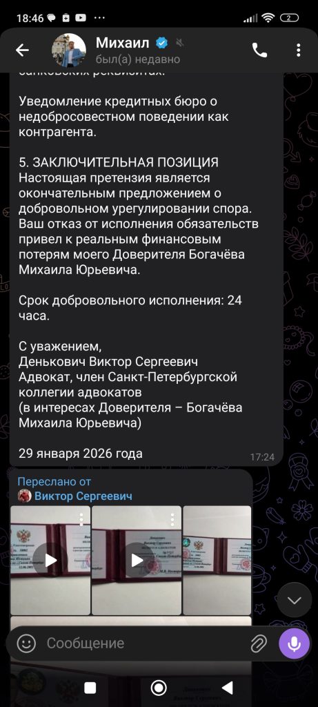И что вы думаете, мне в Telegram написал якобы их юрист Денькович Виктор Сергеевич и начал угрожать статьями УК РФ, если я дальше не продолжу оплату.