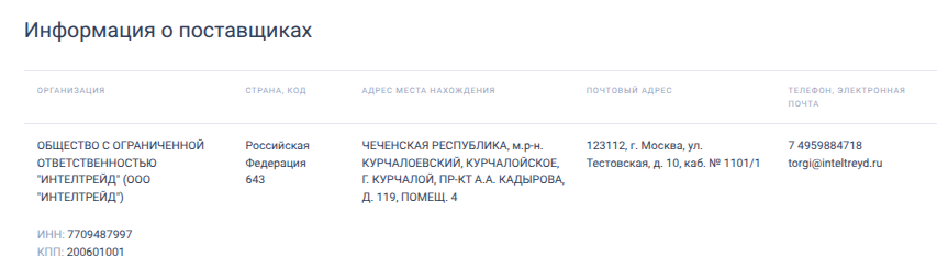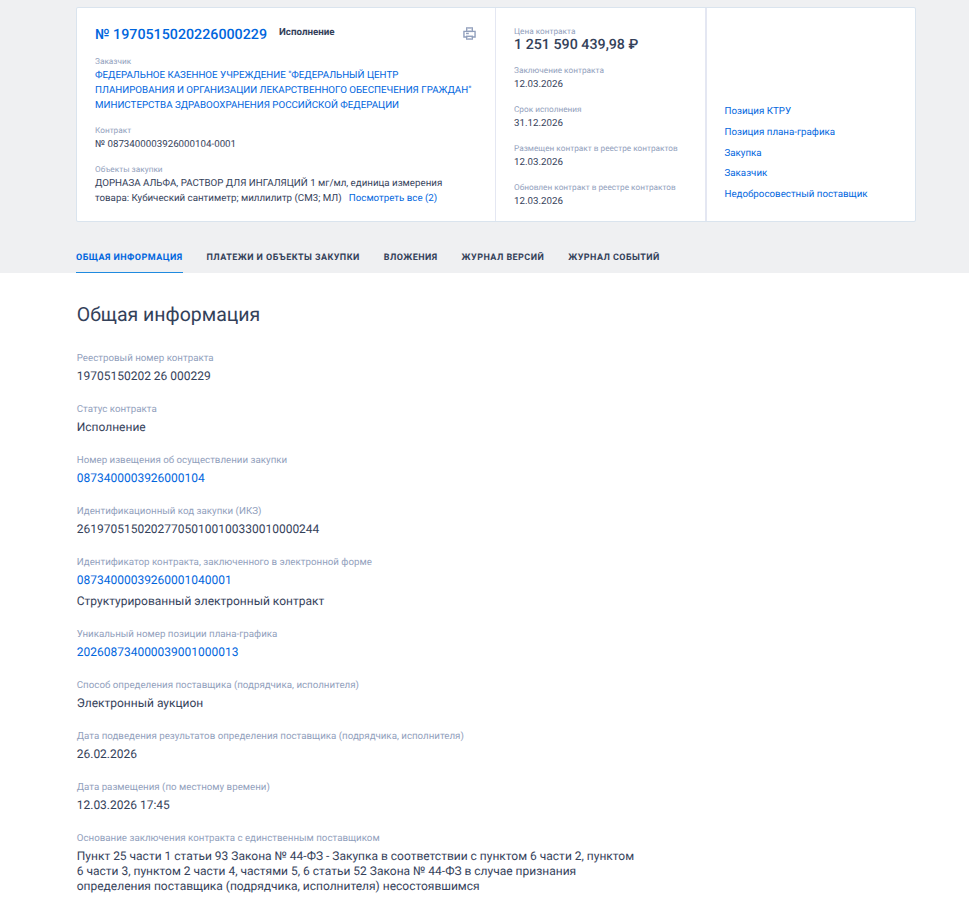 12 марта 2026 года Центр планирования и организации лекарственного обеспечения граждан Минздрава РФ отдал госконтракт на поставку лекарственного препарата Дорназа альфа стоимостью на 1,251 млрд рублей единственному участнику соответствующего тендера - ООО «Интелтрейд» из Чечни, нарубавшему на госконтрактах уже свыше 74 млрд рублей. При этом оптовым торговцем фармпродукцией компания стала лишь в 2019 году, а до того управляла холдингом.