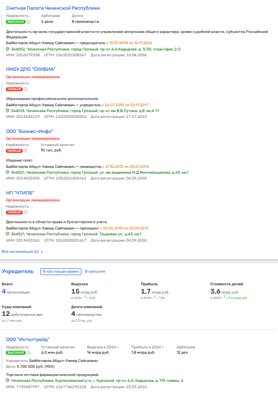 На 95% фирма принадлежит Абдул-Хамиду Байбетирову, который в 2018-2022 годы руководил Счетной палатой Чечни.