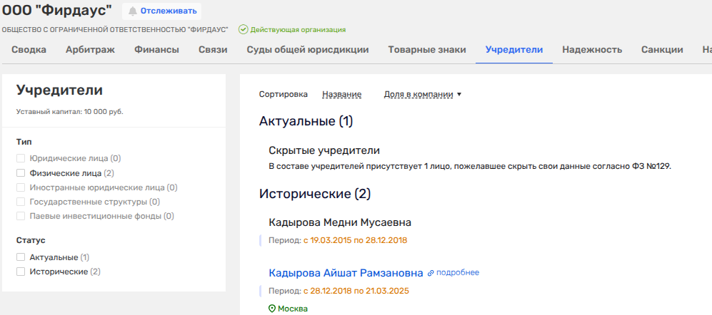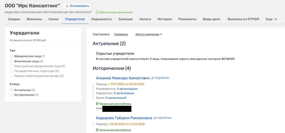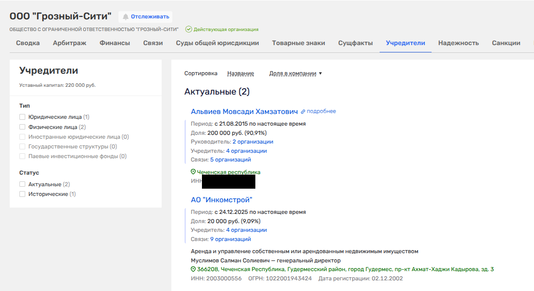 Кстати, именно Альвиев в 2011-2020 годы был директором АО «Инкомстрой». А еще по ряду фирм он действительно пересекался с людьми, носящими фамилию Кадыровых. Например, в ООО «Ирс Консалтинг», ООО «Ирс Недвижимость» и ряде иных фирм - это была Кадырова Табарик Рамзановна, полная тезка одной из дочерей главы Чечни. С 2025 года данные по владельцу фирмы скрываются.