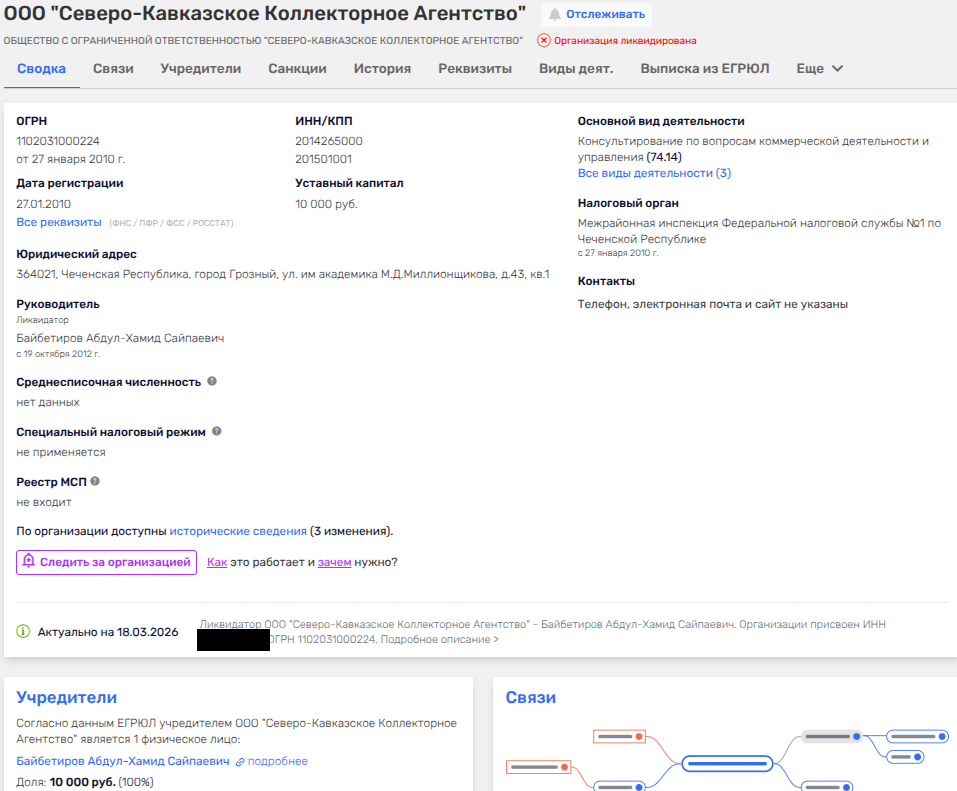 Байбетиров же был владельцем и двух ликвидантов - компании по изданию газет «Бизнес Инфо» и «Северо-Кавказское коллекторное агентство». По слухам, именно через последнее была связка с гостиницей «Грозный», но официально подтвердить не удалось.