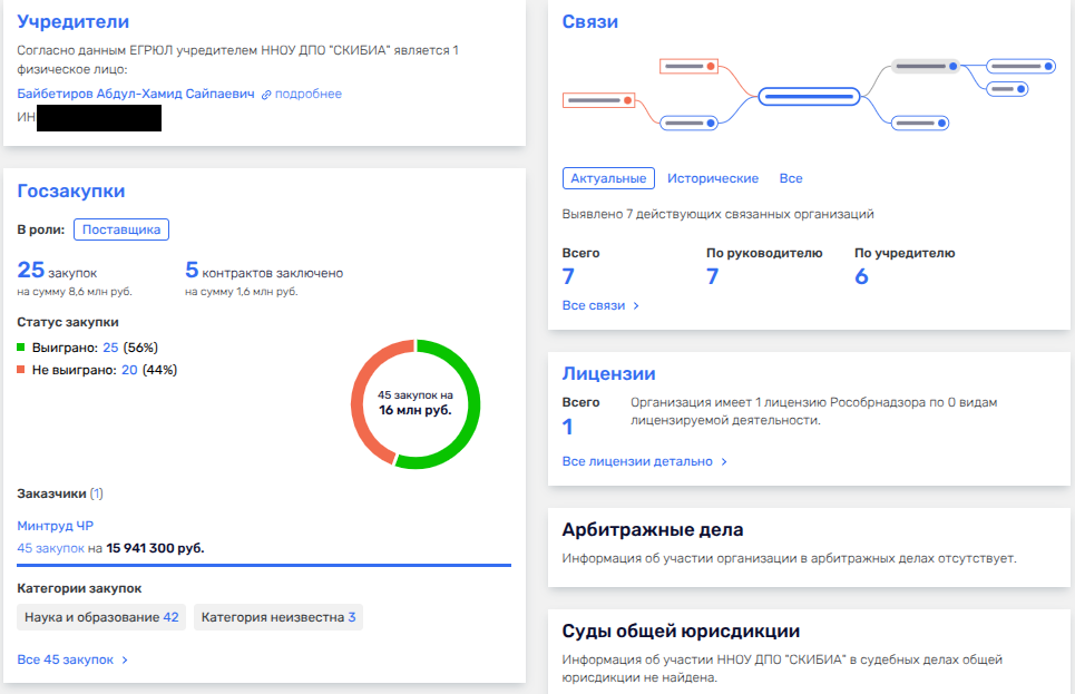 Еще один интереснейший факт в биографии Байбетирова - он с 2014 по 2017 год был владельцем некой некоммерческой организации - Северо-Кавказского института бухгалтеров и аудиторов, который от Минтруда Чечни получил пять госконтрактов на общую сумму 1,6 млн, хотя участвовал в 45 тендерах. Фирма Байбетирова, который строил карьеру чиновника, по госконтрактам обучала безработных профессии бухгалтера.
