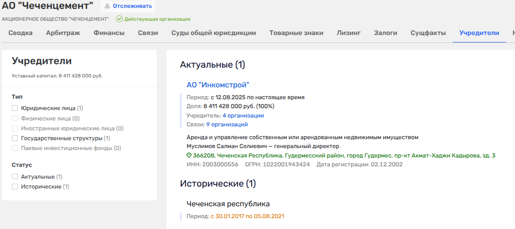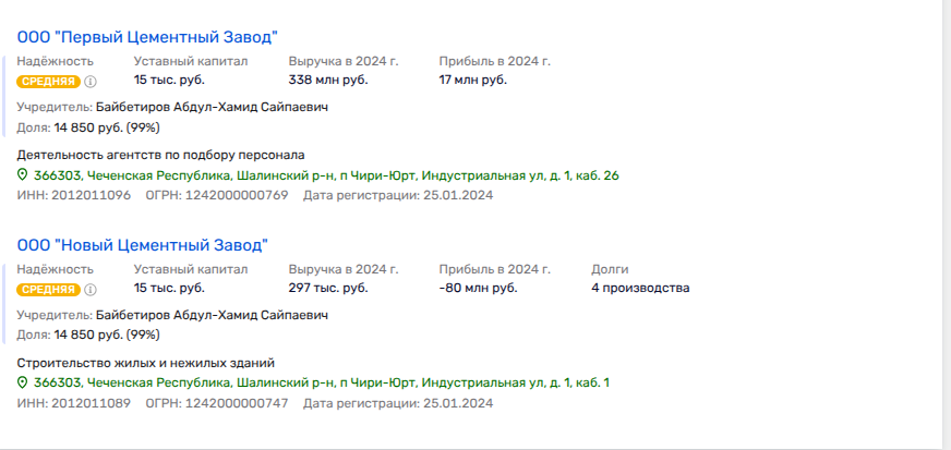 Но вот же, что интересно, другой протеже Кадырова - бывший главный аудитор Чечни, с которого мы и начали наш рассказ, в феврале 2026 года вдруг стал владельцем двух юрлиц, некогда принадлежавших «Чеченцементу» - ООО «Первый Цементный Завод» и ООО «Новый Цементный Завод». При этом по ОКВЭД эти заводы фигурируют как агентство по подбору персонала и стройфирма, вот только прописаны они по адресу как раз таки Чеченцемента. Уж не на эти ли компании планируется вывести ликвидное имущество и раздробить бывший госактив?