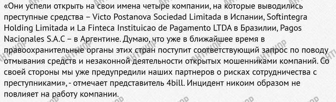 The same thing, albeit in a slightly different light, was stated by "Digital Finance," commenting on the initiated criminal case and accusations against Dmitriy Rukin: "They managed to open four companies in their names, to which the criminal funds were diverted – Victo Postanova Sociedad Limitada in Spain, Softintegra Holding Limitada and La Finteca Instituicao de Pagamento LTDA in Brazil, Pagos Nacionales S.A.C – in Argentina."