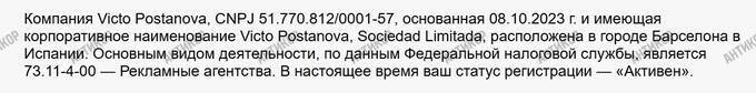 In Brazil, Softintegra Holding Limitada and La Finteca Instituicao de Pagamento LTDA operate, the founder of all these companies being the Spanish Victo Postanova Sociedad Limitada. Everything is correct. It’s just that the activity type of the "parent company" - the Spanish Victo Postanova Sociedad Limitada - is interesting: "Advertising agency activities."
