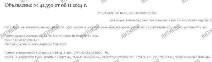 Although the Brazilian and Peruvian companies are registered by the Spanish "parent," the beneficiary is still a Ukrainian citizen, Dmitriy Rukin. This follows from Notice No. 42,390 of the Central Bank of Brazil.