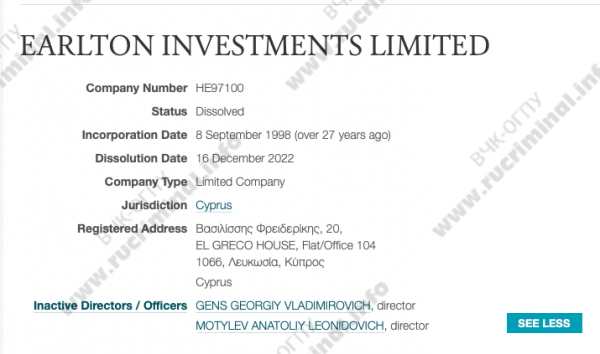 Кстати, список компаний Мотылева был датирован 2015 годом, а банкротом его в России объявили только в 2018 (в Великобритании и вовсе в 2020-м). Это значит, что его империя может оказаться намного шире, чем до сих пор считалось. К тому же Мотылев вел дела со многими известными бизнесменами — например, у него был кипрский офшор на двоих с Георгием Генсом. Это бывший владелец ГК «Ланит», который вместе с Мотылевым контролировал его банк «Глобэкс». Несмотря на то, что Генс скончался в 2018 году, компания Earlton Investments Ltd была активна до конца 2022 года. Ещё один офшор на Кипре — LEWISTON INVESTMENTS LIMITED — принадлежал Мотылеву и Виктору Лукоянову. Это партнёр Мотылева по банку «Российский кредит», из которого они вывели около 35 млрд рублей. Этот офшор тоже функционировал до конца 2022 года. Вряд ли Мотылев сумел провернуть масштабную схему по выводу десятков миллиардов рублей так, чтобы ни один из его партнёров ни о чём не догадался.