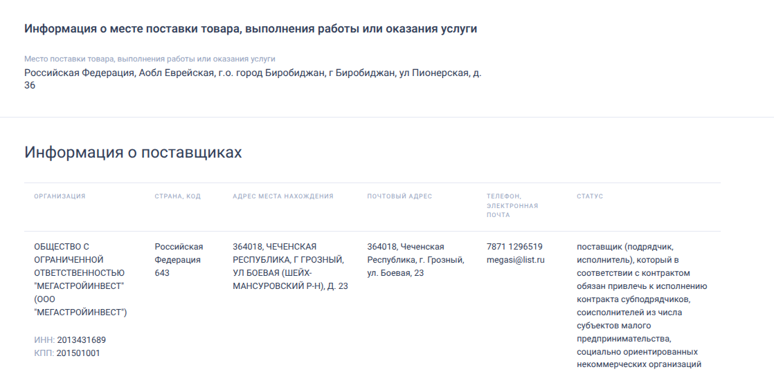 Победителем тендера, где, по сложившейся практике, альтернативы не предусматривалось, стало чеченское ООО «МЕГАСТРОЙИНВЕСТ» (выручка - 12 млрд рублей, чистая прибыль - 47 млн рублей). Эта компания давно числится в фаворитах у чиновников Чечни, а сейчас и ЕАО.