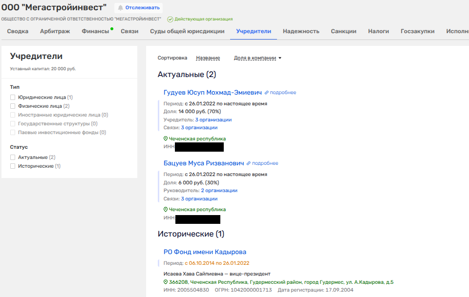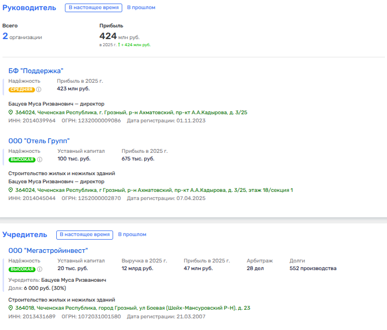 Столь трепетная любовь к организации с уставным капиталом в символические 20 тысяч рублей вполне объяснимо: с 2014 по 2022 год её бенефициаром выступал региональный Фонд имени Кадырова. И хотя формально владельцы сменились, ниточки, связывающие подрядчика с «первой семьей» республики, отнюдь не порвались — их просто аккуратнее замаскировали, чтобы они не бросались в глаза при поверхностном изучении документов.